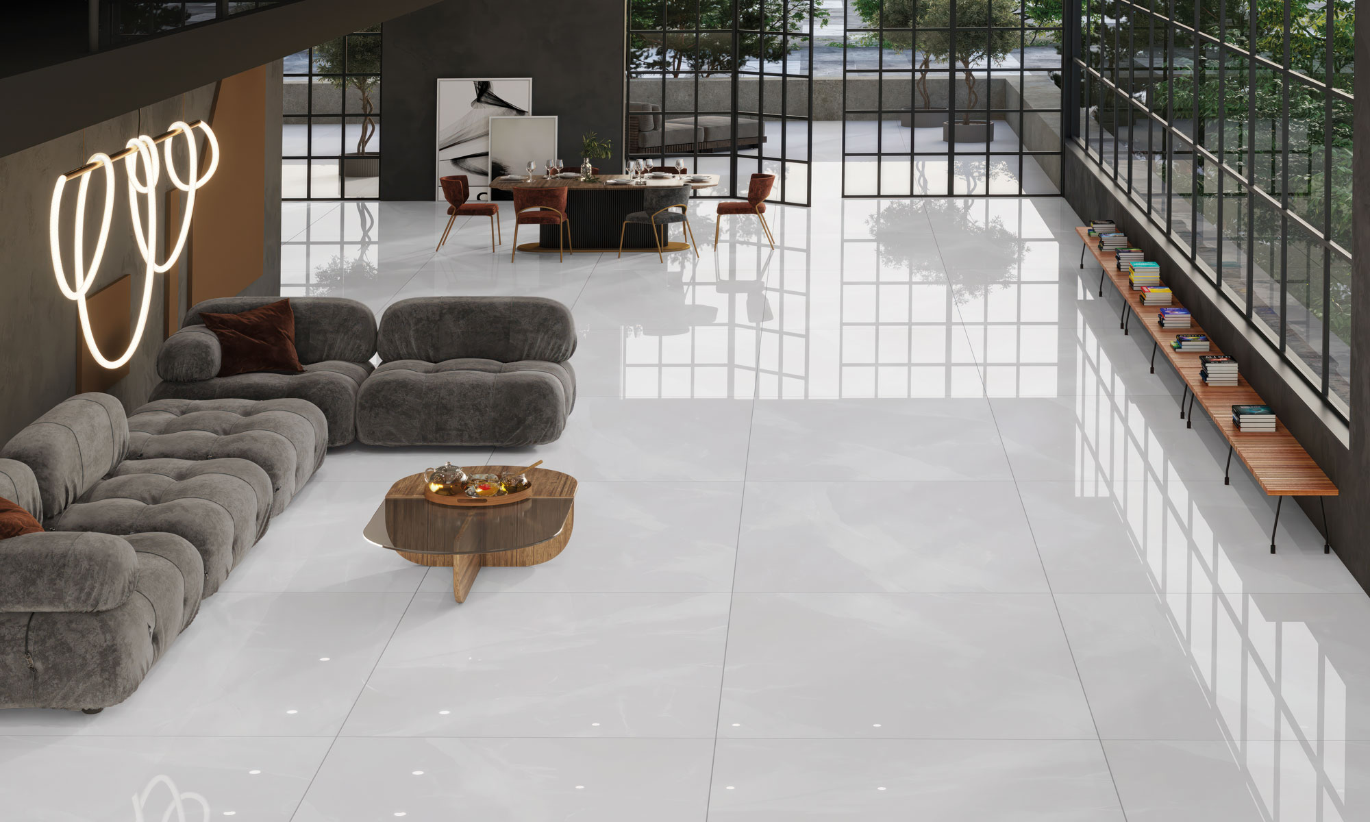 Onyx White features a sleek polished surface that adds brightness and a sophisticated look to any floor or wall. Its rectified edges ensure precise alignment and a seamless, refined finish, making it ideal for residential spaces.