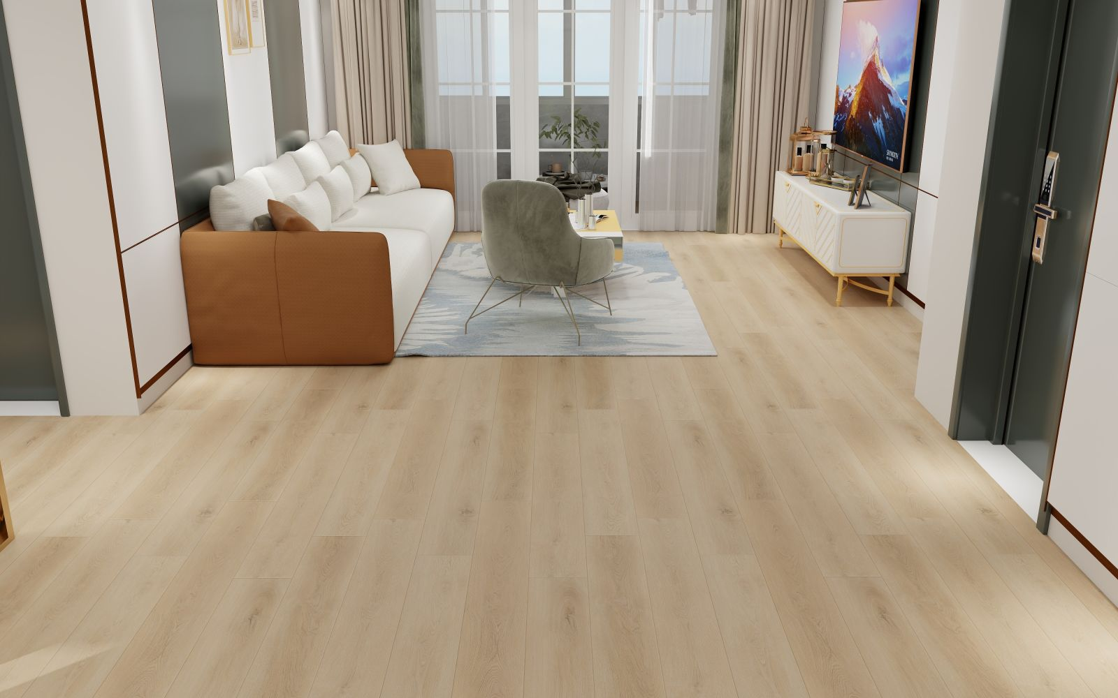 District Max Scarsdale LVP features a light oak tone with realistic EIR texture and square-edge design. Its 2.5mm thickness and UV aluminum oxide finish make it durable for residential and commercial glue-down installations.