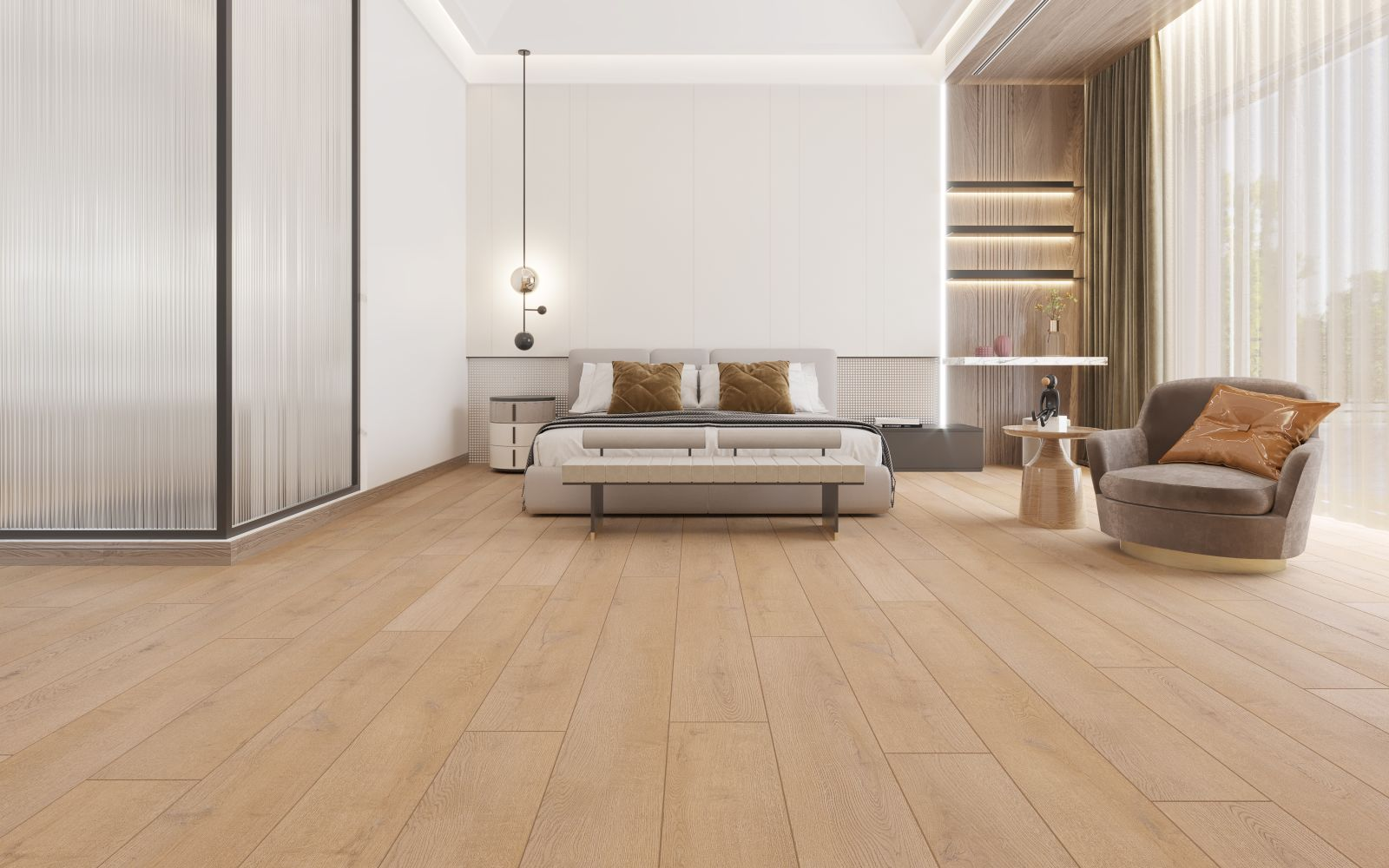 Indoor Delight Farmstead SPC flooring combines the warmth of medium oak with a realistic EIR wood-grain embossed surface and painted bevel edges. Its 6.5mm thickness with antibacterial acoustic padding ensures comfort, durability, and sound reduction in residential and commercial spaces. Floating installation allows for quick and easy setup.